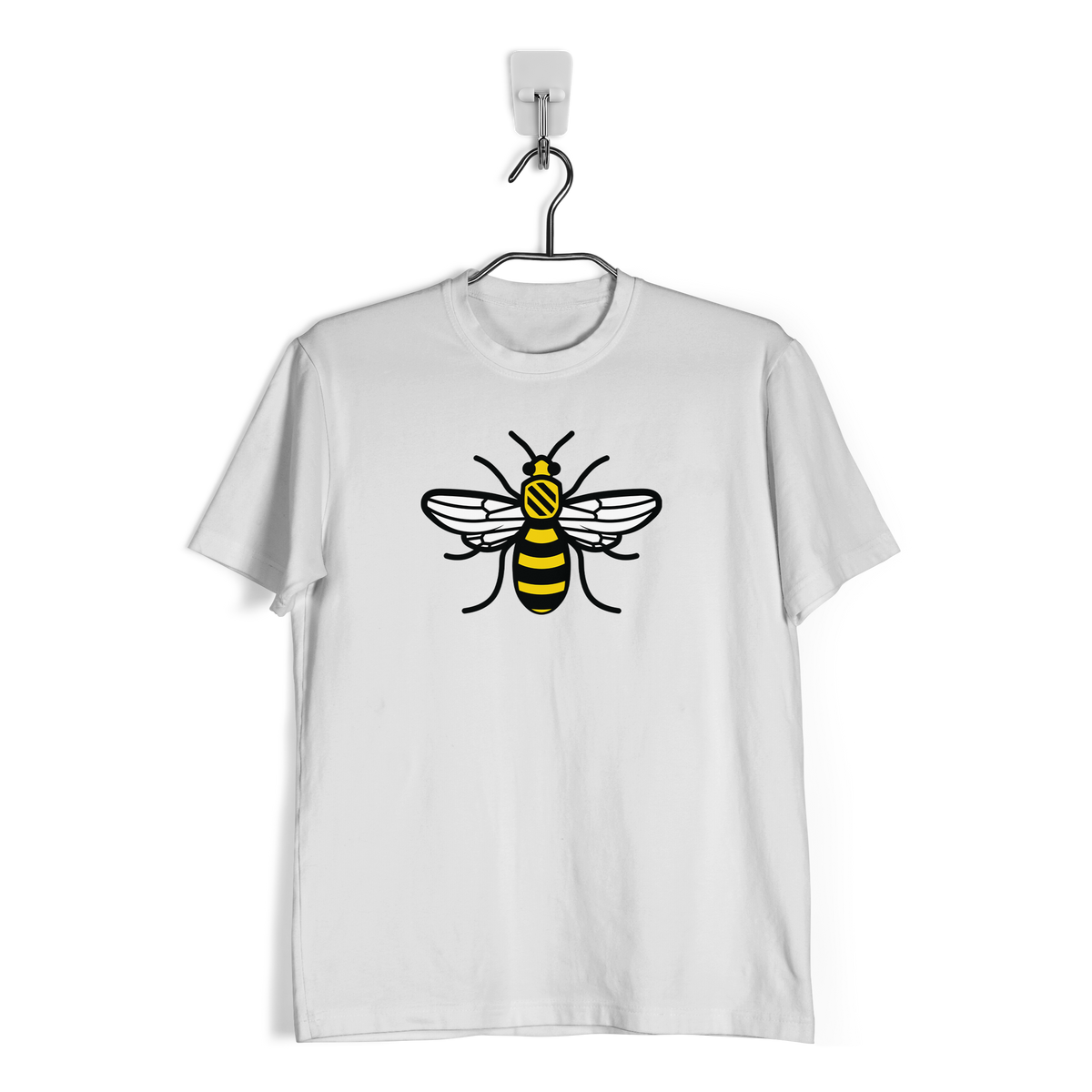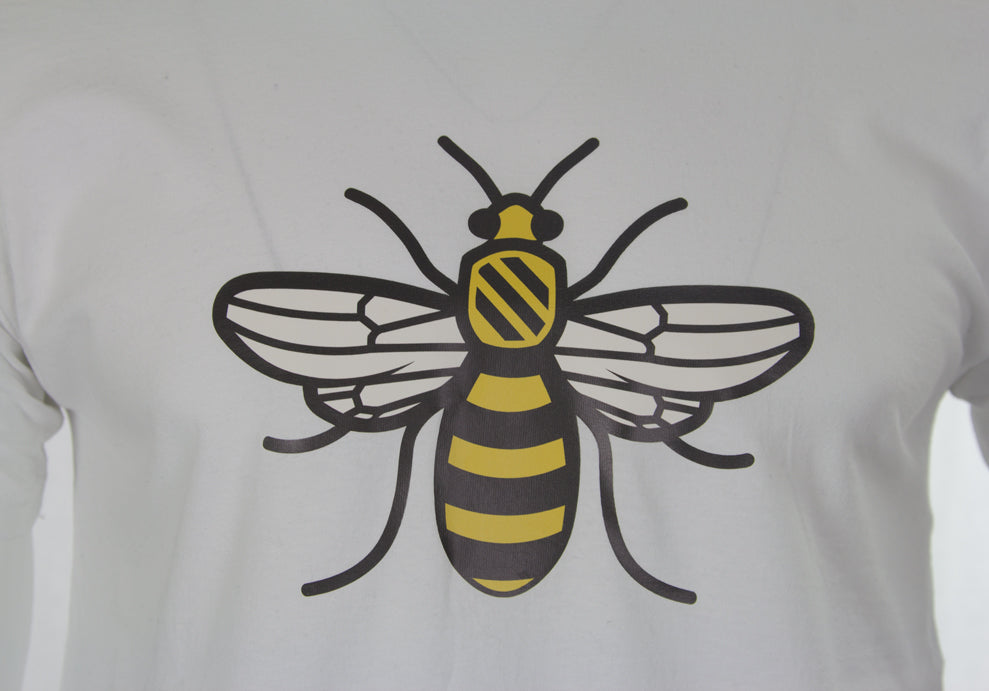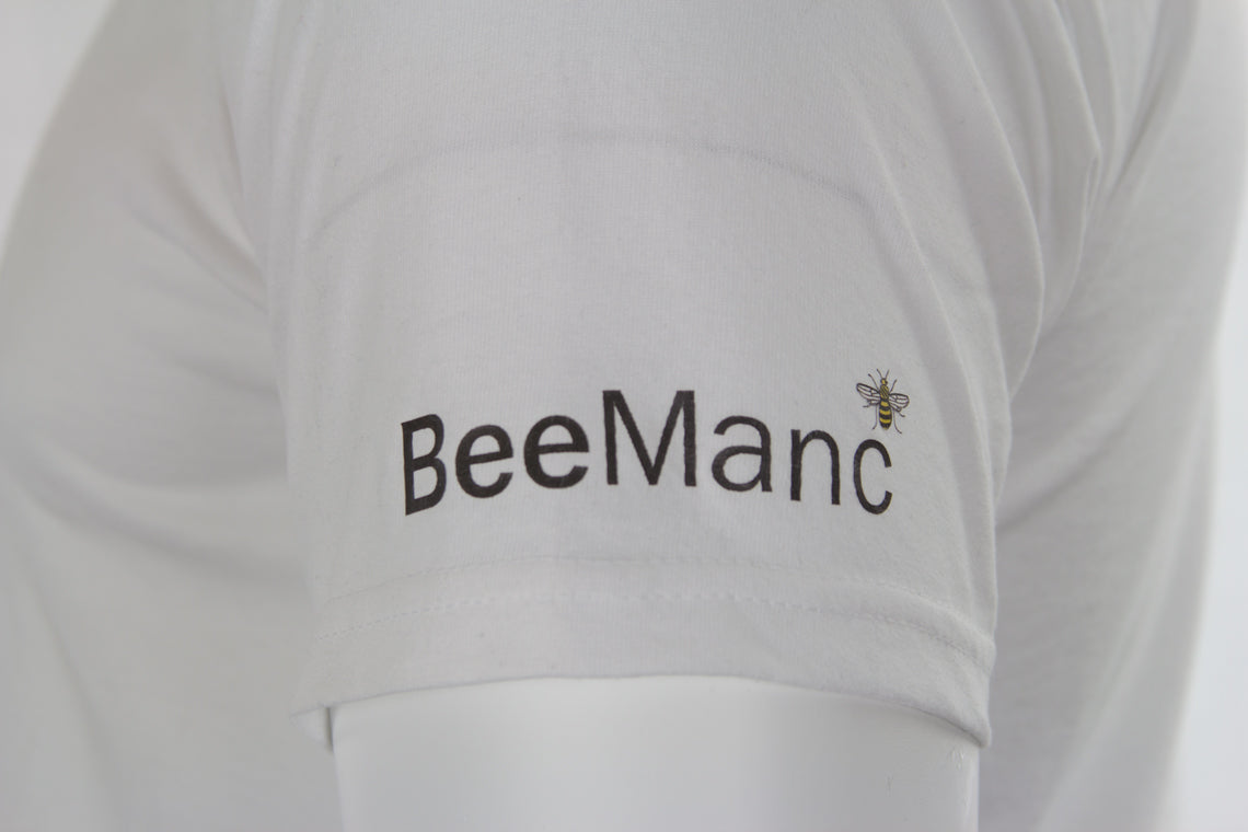 Our unique BEE has the double wing as depicted in the Coat of Arms of Manchester and our designer added the three diagonal strips from the same, the stripes represent the three main rivers of Manchester: Irwell, Irk and Medlock. BeeManc logo is on the arm too!